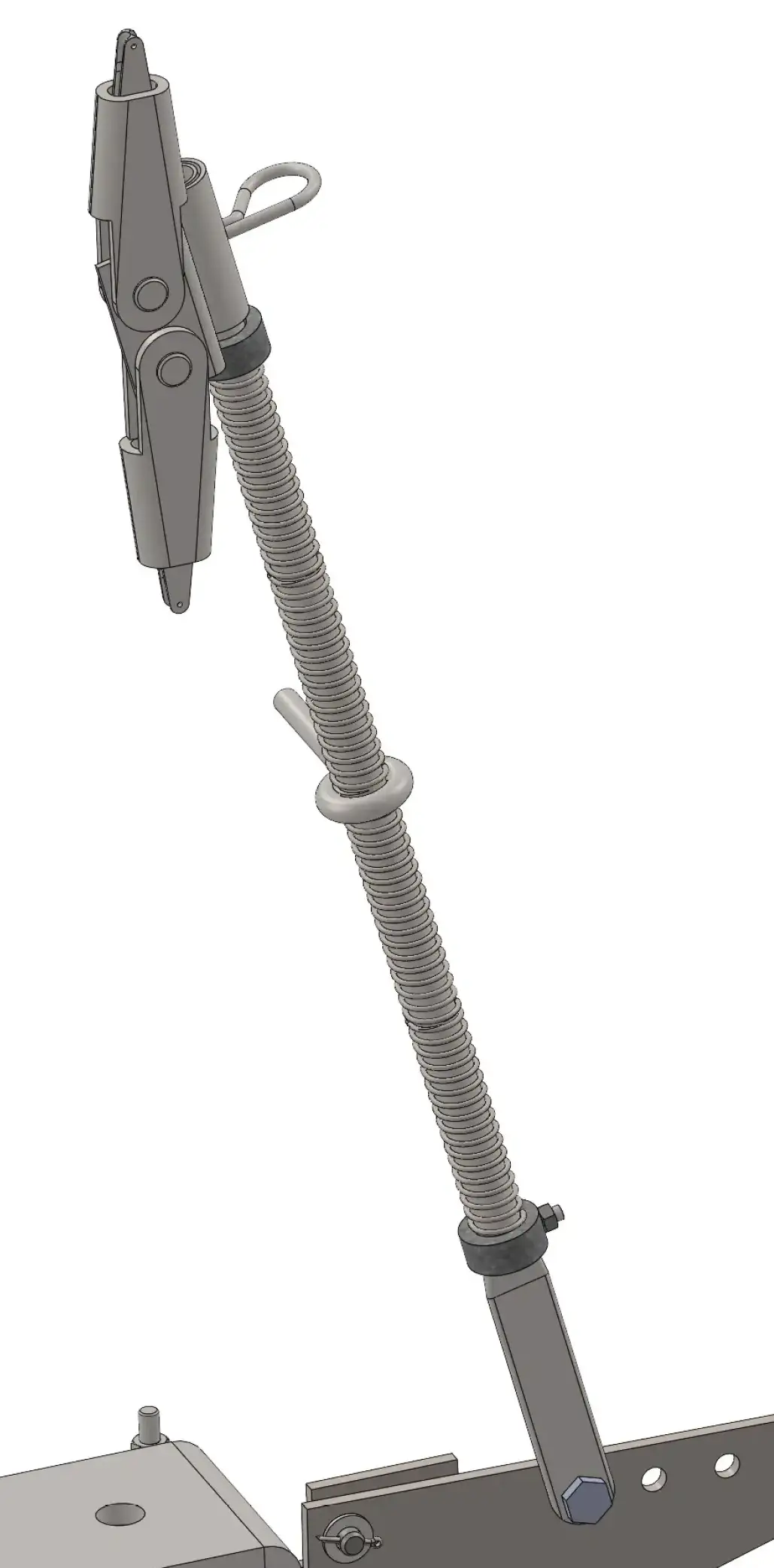 Das Geschwindigkeitsbegrenzerseil kann alternativ auch direkt mit einem Zug-/Druckrohr an die Drehscheibe der Fangvorrichtung angebunden werden. Wichtig ist, dass das Zug-/Druckrohr geführt wird, damit es nicht ausknicken kann. Das ist insbesondere in der Mitte des Rohrs sehr wichtig.