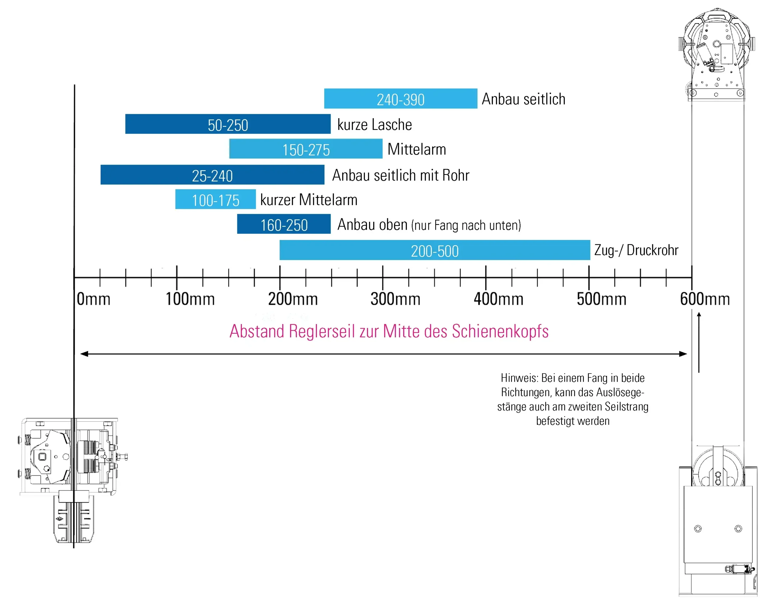 Unsere Standardauslösung für einen Abstand zwischen Geschwindigkeitsbegrenzerseil und Mitte der Führungsschiene von minimal 240mm und maximal 390mm